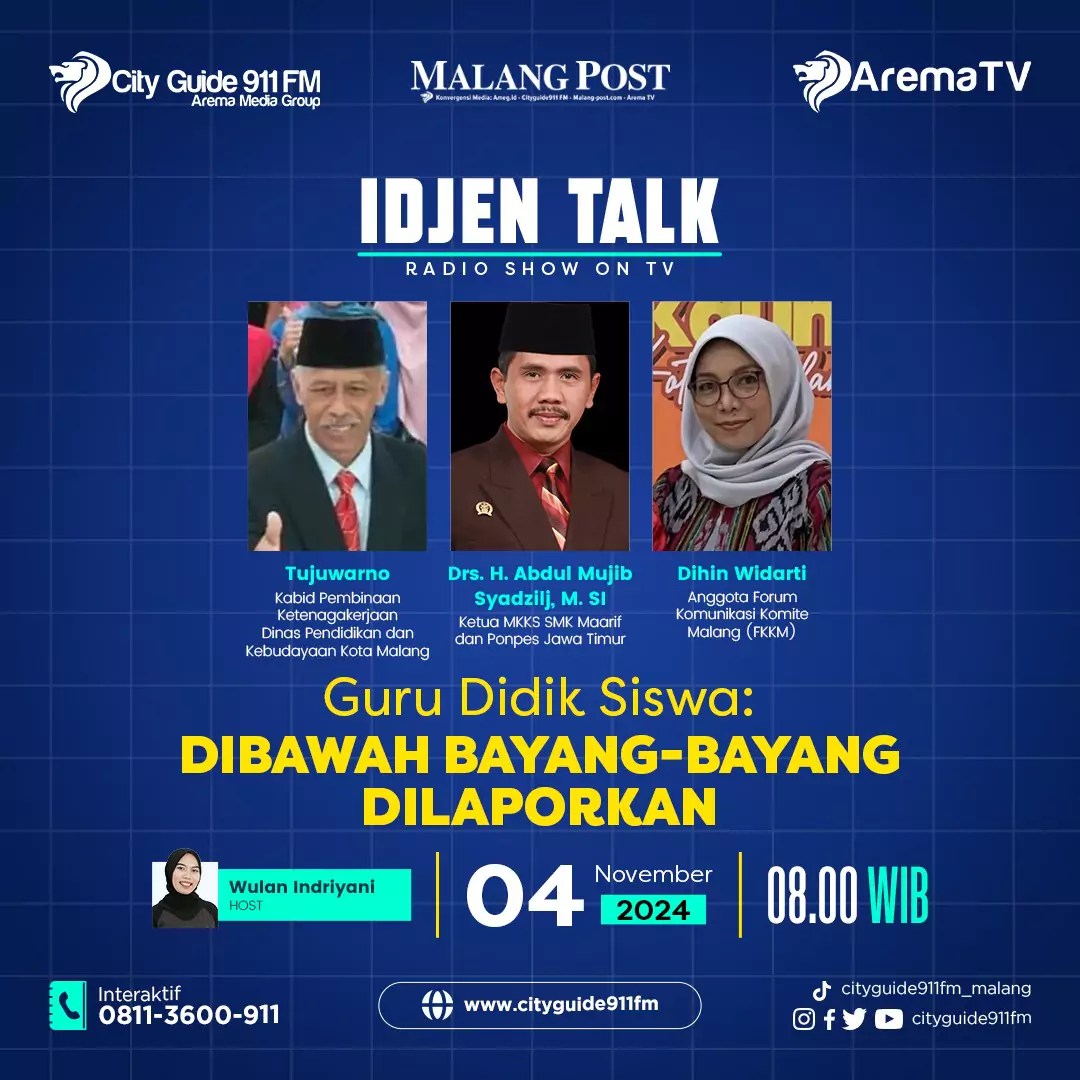 CITY GUIDE FM, IDJEN TALK – Profesi guru saat ini tengah menjadi perhatian masyarakat, ketika kasus kriminalisasi guru bermunculan. Tidak sedikit guru yang harus mendekam di penjara gegara orang tua murid tidak terima anaknya ditegur atau didisiplinkan.