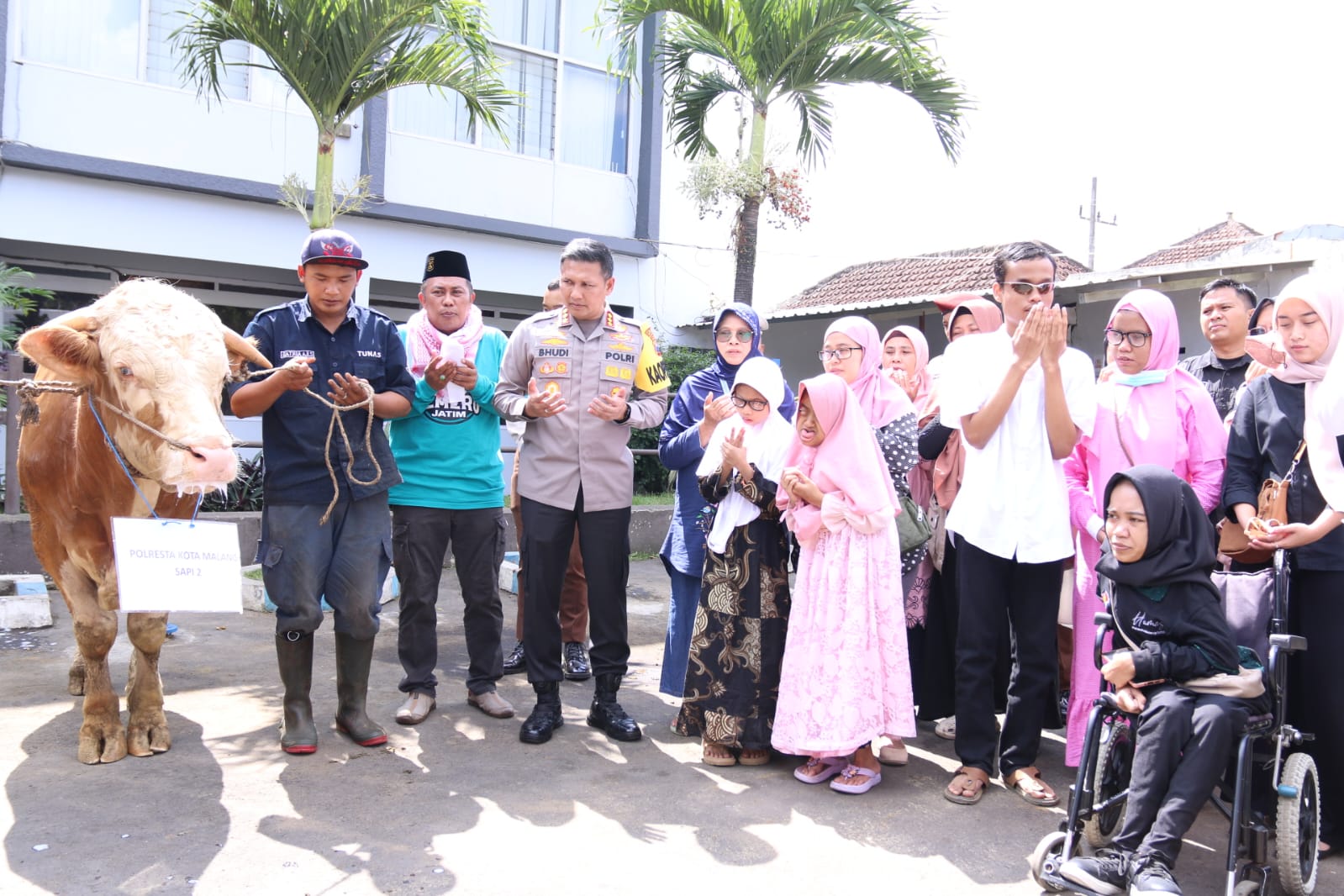 CITY GUIDE FM, KOTA MALANG – Polresta Malang Kota bertepatan di Hari Raya Kurban dan Hari Bhayangkara ke 77, memberikan satu ekor sapi kurban. Hewan kurban itu akan diberikan kepada empat orang difabel dan pekerja harian lepas (PHL) di lingkungan Polresta Malang Kota.